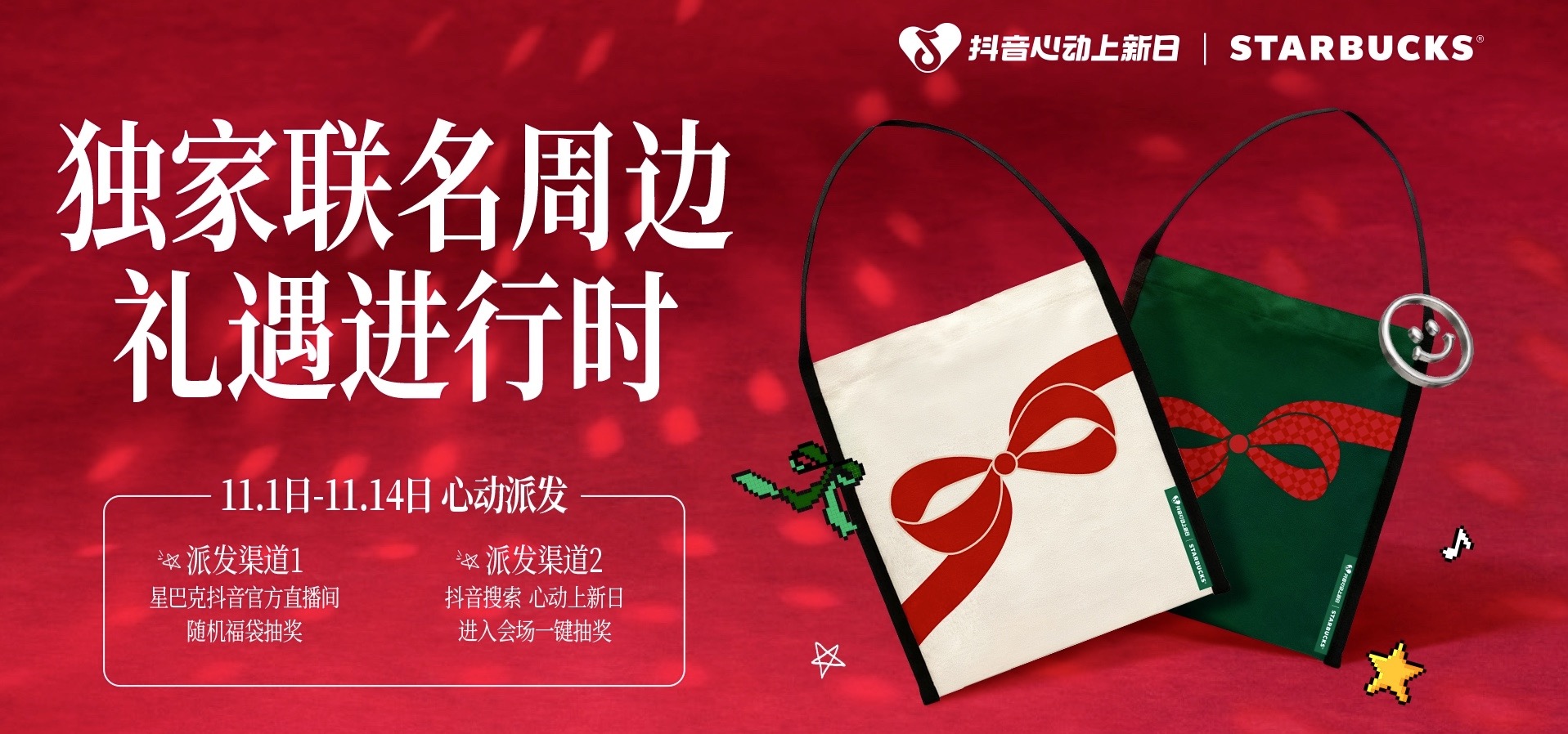 在11月1日至11月4日期间,消费者可通过进入星巴克抖音官方直播间,参与定时发放的随机福袋抽奖或在抖音搜索 “心动上新日” 进入活动主会场,参与一键抽奖领取。